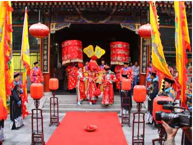 仿膳飯莊的婚宴很有中國傳統氛圍。新娘可以坐著八抬大轎,在眾多吹鼓手吹吹打打的簇擁下,從北海公園東門進入公園,過石橋、穿游廊再回到仿膳飯莊的大門口。新郎則將蒙著蓋頭的新娘扶下轎,在繽紛的禮花中牽著新娘邁火盆、過馬鞍,走進雕梁畫棟、金碧輝煌的漪瀾堂大廳,舉行隆重的婚禮。飯莊還為新人準備了大紅喜帳、紅地毯、香檳酒塔臺、音響等設備。如果新人有興趣,還可以租一艘龍舟,在北海水上環湖一周,寓意即將到來的新生活順風順水。
