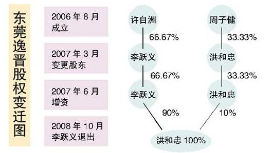 那么李躍義又是何時介入到東莞逸晉的呢?據(jù)東莞逸晉的公司決議,在2007年3月的一次股東會上,許自洲、周子健以原出資金額將手上的全部股權(quán)分別轉(zhuǎn)給了李躍義和洪和忠。轉(zhuǎn)讓后,李躍義獲得了許自洲手上的66.67%股權(quán)。隨即,公司章程也進行了修改,李躍義擔任了公司唯一一名執(zhí)行董事、經(jīng)理和法定代表人。