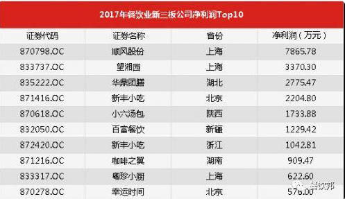 2017年餐飲業(yè)新三板公司凈利潤(rùn)Top10榜單如下: