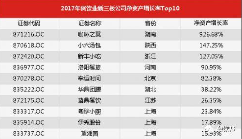 2017年餐飲業(yè)新三板公司凈資產(chǎn)增長(zhǎng)率Top10榜單如下: