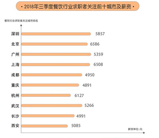 58同城的報告則顯示,2018年第三季度餐飲業(yè)求職者關(guān)注的前十城市分別為深圳、北京、廣州、上海、成都、重慶、杭州、武漢、長沙、西安,北上廣深四大一線城市成為最受歡迎的城市。