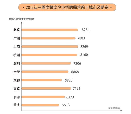 這份報告的數(shù)據(jù)來看,今年第三季度餐飲企業(yè)招聘需求量前十城市依次為北京、廣州、上海、杭州、深圳、合肥、成都、南京、長沙、重慶,北上廣包攬了餐飲企業(yè)招聘需求量的前三名。